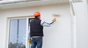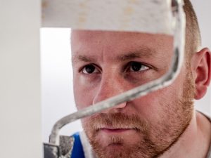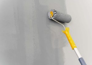 painter with cap painting a wall with paint roller and wooden vintage ladder, with copy space